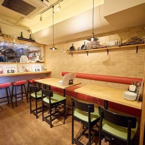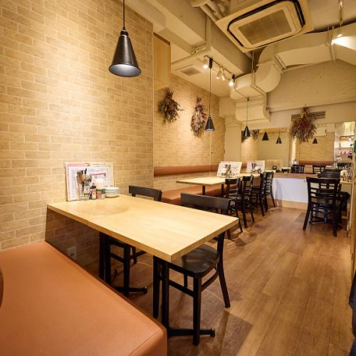 木目調・レンガ調の内装で暖色系にまとめた店内。温かみがあり、カジュアルながらゆったり寛げる空間です◎